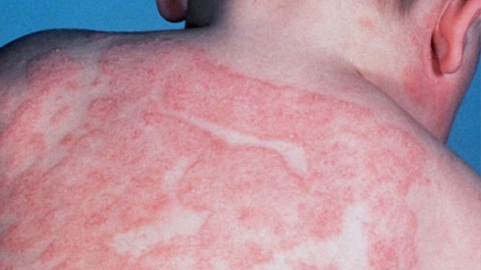 - Kemerahan pada kulit dapat disertai bercak abu-abu kecokelatan, terutama di tangan, kaki, pergelangan kaki, pergelangan tangan, leher, dada bagian atas, kelopak mata, di dalam lekuk siku dan lutut, wajah, dan kulit kepala.