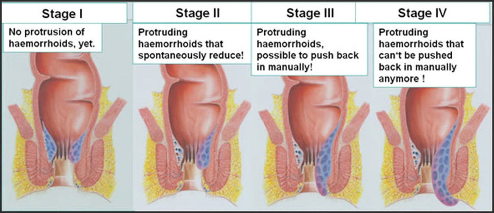 - Stadium tiga :ukuran tonjolan sudah lebih besar. Gejalanya selesai buang air besar tonjolan keluar dan tidak akan masuk lagi kecuali didorong dengan tangan.